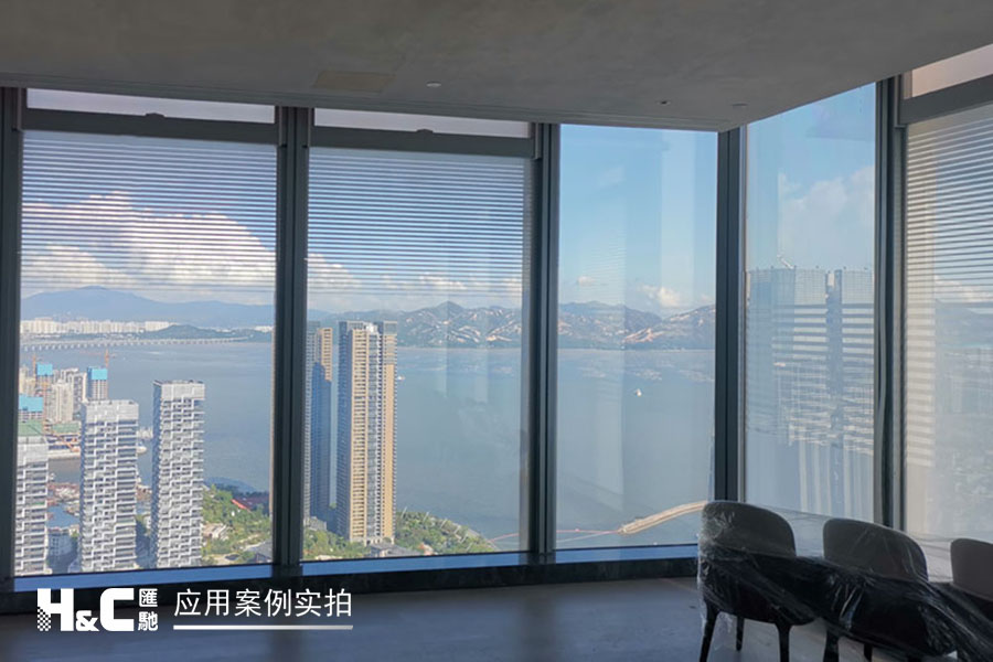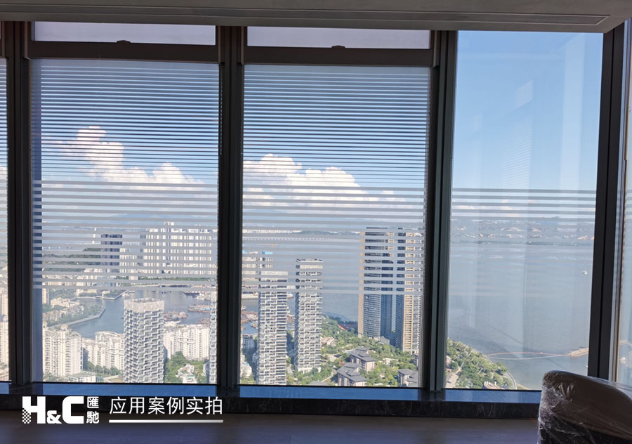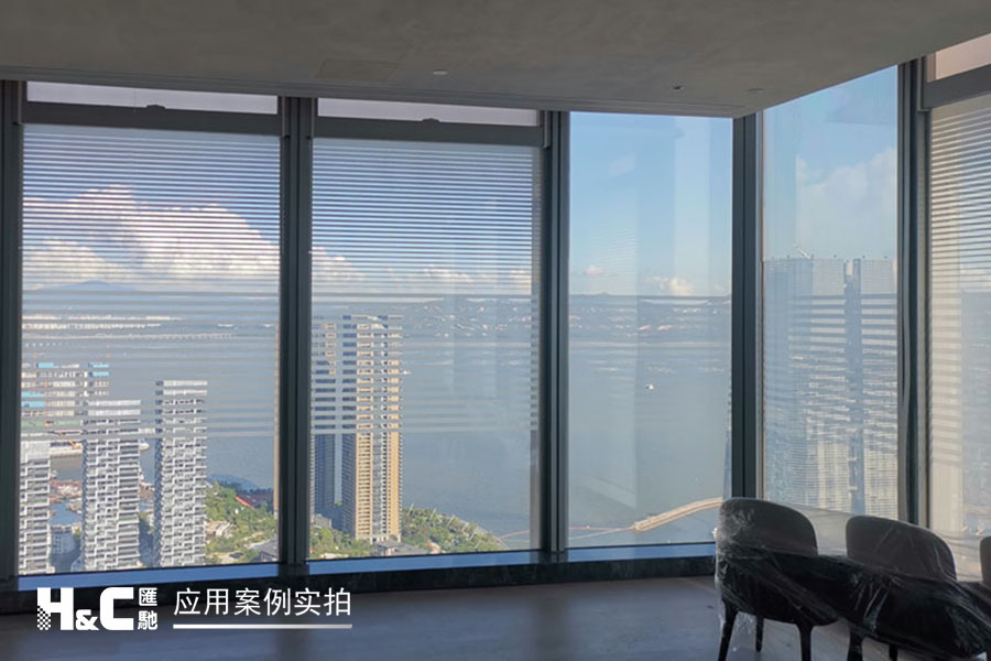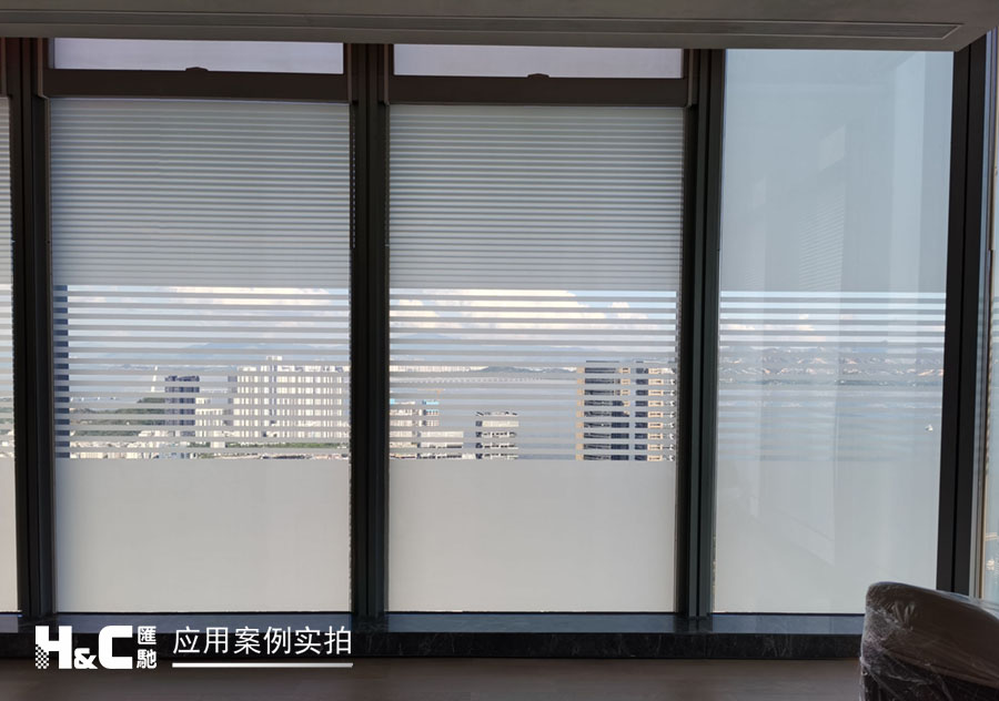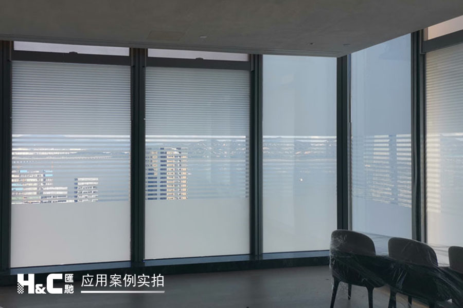 外立面的玻璃采光極好,但有時室外復雜的光線也會對室內造成困擾。本案業主采用了廣州匯馳實業提供的百葉調光膜,貼在玻璃內表面,讓普通玻璃變成調光玻璃。百葉的變化效果可以用遙控調控,有效控制光線的進入,讓玻璃變得更有科技感。