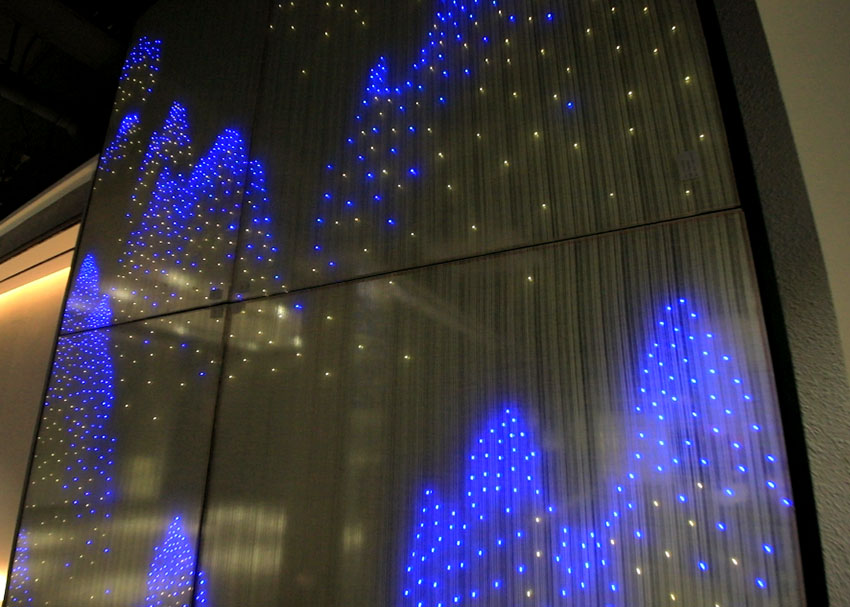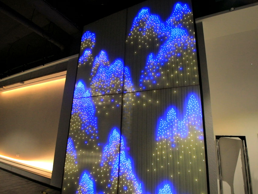 隨著LED光源亮度的強(qiáng)弱變化,山峰隱約閃現(xiàn),遠(yuǎn)近高低各有不同韻味。在光線稍暗的場(chǎng)合中,LED光源組成的圖形更為耀眼矚目。