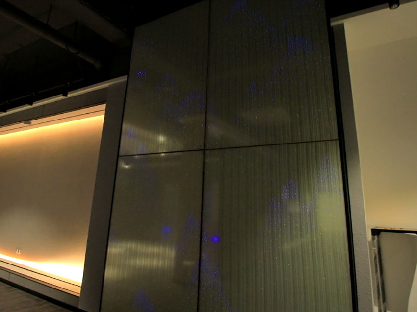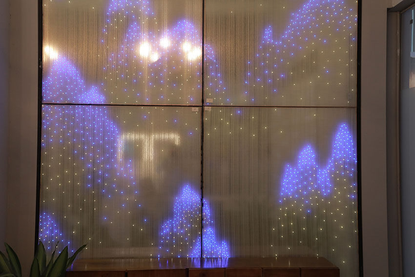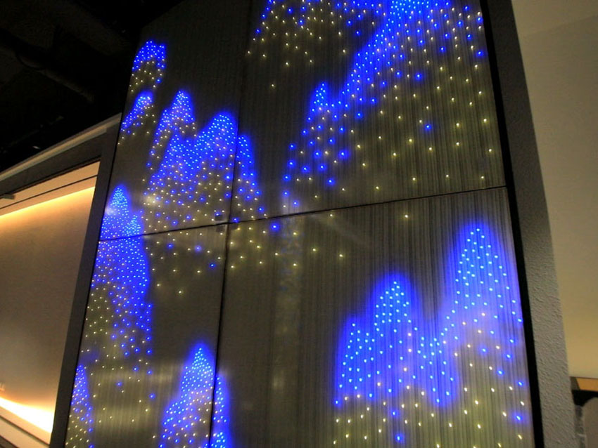 構(gòu)筑空間的美感,營(yíng)造獨(dú)特的空間魅力,高密度的點(diǎn)點(diǎn)LED光源,通過(guò)不同燈光顏色的組合,在玻璃上鑲嵌出了一幅山峰高低起伏的圖畫。原本平面的玻璃背景墻,呈現(xiàn)出立體的觀感。