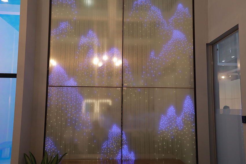 該玻璃以藝術(shù)玻璃為基礎(chǔ),與LED燈珠、導(dǎo)電膜、EVA等經(jīng)特殊工藝夾合制成。4片玻璃里面點(diǎn)綴了上千顆LED燈珠。LED燈珠不發(fā)光時(shí),它就是一款普通的夾絲玻璃。
