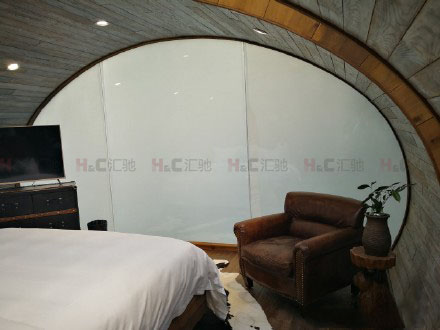 空間雖小但視感良好,打開暖色的燈光,舒適感瞬間提升。屋子的盡頭采用調光玻璃作為隔斷,它擁有透明玻璃和霧化玻璃的雙重特性,可自由切換狀態。白天切換到透明狀態,盡情欣賞外界景色,感受外界變化;晚上切換到霧化狀態,隔開外界影響,盡情享受舒適睡眠。