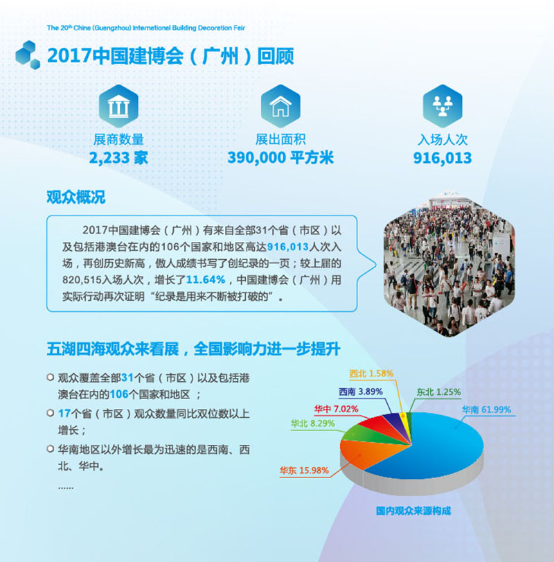 一年一度的中國(廣州)國際建筑裝飾博覽會將于2018年7月8號到11號在廣州琶洲國際會展中心舉辦。此次展會的主題是:為大家居建裝行業提供整體解決方案。